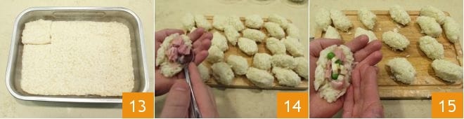 When the rice is cold, divide it into 26 portions of 50 grams each 13; Take one, flatten it slightly with your hands into an oval shape and fill the center with ham 14, peas, and finally the smoked provolone 15.