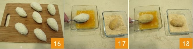 Then close the croquettes with the rice, giving them the typical elongated croquette shape 16. Bread the croquettes by first dipping them in beaten egg 17 and then in breadcrumbs. Repeat the same operation by dipping the already breaded croquette in the egg again and then in the breadcrumbs 18.