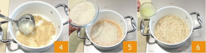 Sauté it for 10 minutes on low heat, adding a ladle of hot broth 4. At this point, add the rice 5 and toast it briefly while stirring. Then, deglaze with 100 ml of wine 6 and continue cooking.