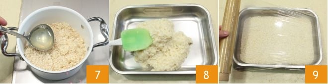 Add broth gradually as the rice absorbs the liquids (it will take about 20 minutes). When cooked, turn off the heat 7. Transfer the risotto to a large baking dish and spread it evenly with a spatula 8; cover the dish with plastic wrap and let it cool 9.