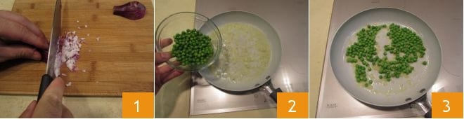 To prepare the baked spaghetti frittatas, start by cooking the peas. Clean and finely chop the onion 1, then add it to a pan with half the oil, let it soften over low heat, and add the peas 2. Cook the peas for 5-6 minutes 3, adding a couple of tablespoons of water. Turn off the heat, add salt and pepper, and let cool.