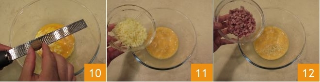Add the salt, pepper, nutmeg 10, provolone cubes 11, and ham cubes 12.