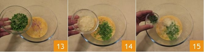 Add the now-cold peas 13, grated Parmesan cheese 14, and marjoram leaves 15.