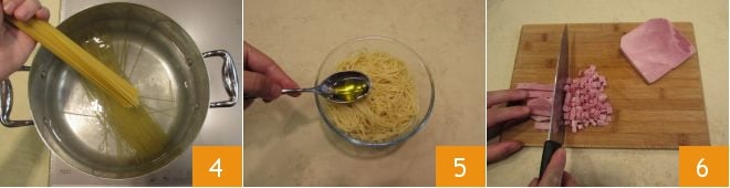 In the meantime, cook the pasta in plenty of boiling water, salted to taste 4, for 3-4 minutes at most. Drain it and place it in a bowl, add the remaining oil 5 to prevent the spaghetti from sticking together, and let cool. Cut the ham into cubes about 1/4 inch in size 6.
