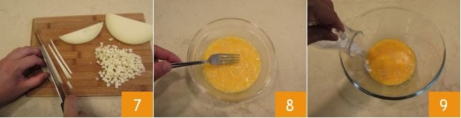 At this point, cut the provolone cheese to the same thickness as the ham 7 and set the cubes aside. In a sufficiently large bowl, break the eggs, beat them 8, and add the milk 9.