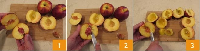 To prepare baked stuffed peaches, start by rinsing and drying the peaches. Cut each peach in half 1, then use a small knife to remove the pit 2. Scoop out a little of the flesh around the pit's hollow 3. Set the peaches aside.