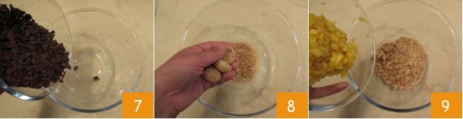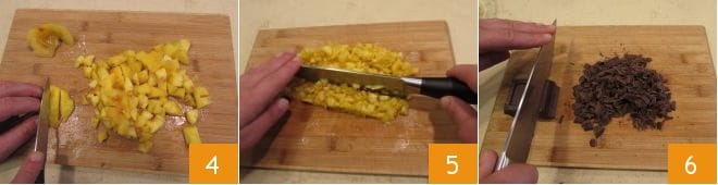 Now, focus on the filling: chop the flesh removed from the peaches 4 and mince it with a knife 5 or alternatively using a food processor. Set aside. Take the chocolate and finely chop it 6.