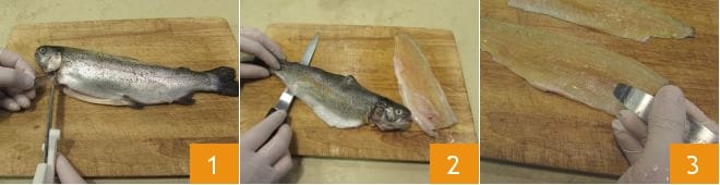 To prepare baked trout, first, gut the fish if necessary, then remove the fins 1 and slice the flesh parallel to the work surface to obtain fillets 2. For more information on cleaning fish, you can consult our cooking school on how to clean salmon trout. Once you have obtained 4 fillets, remove the bones with kitchen tweezers 3.