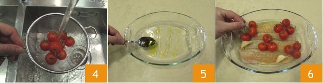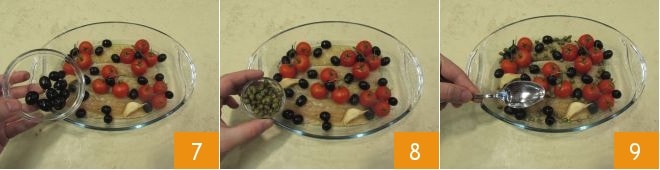 Rinse the cherry tomatoes and leave them whole 4, then rinse the capers to remove excess salt. Grease a baking dish with oil 5 and place the trout fillets inside, salt and pepper to taste, then add the whole garlic cloves, whole cherry tomatoes 6,