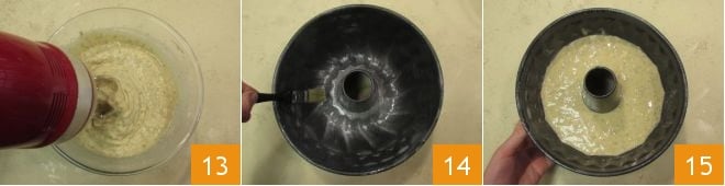 and mix for another minute 13. Grease a bundt cake mold with a diameter of 9 inches and 4 inches in height 14 and pour the batter inside 15.
