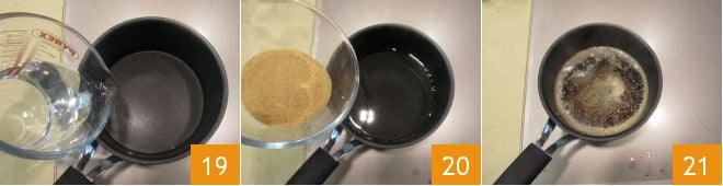 Pour the water 19 and sugar 20 into a saucepan without stirring, bring to a boil, and let it simmer for about 3-4 minutes 21.