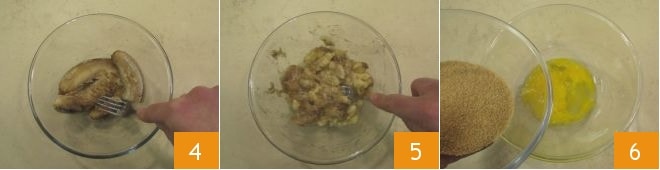 Mash the bananas with a fork 4 to obtain a puree 5. Meanwhile, in a bowl, pour in the eggs, the sugar 6