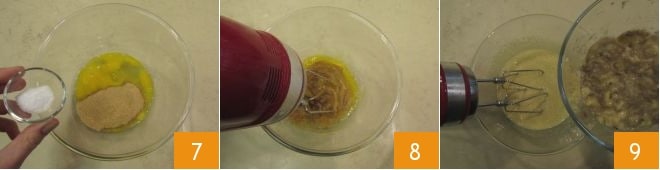 and the salt 7. Use electric beaters to mix the ingredients 8 until the mixture is light, then add the banana puree 9.