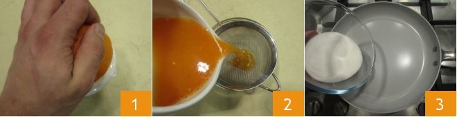 To prepare the bananas flambé, start by squeezing the orange 1 and straining the juice 2. Then take a non-stick pan and put it on the heat to melt the sugar 3.