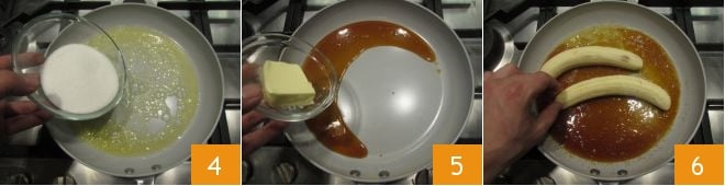When it starts to caramelize 4, achieving a dark blonde color, add the butter 5. As soon as the butter has melted, add the whole peeled bananas to the pan over low heat for 1-2 minutes 6. Turn them gently on both sides to avoid breaking, making sure they absorb heat evenly.