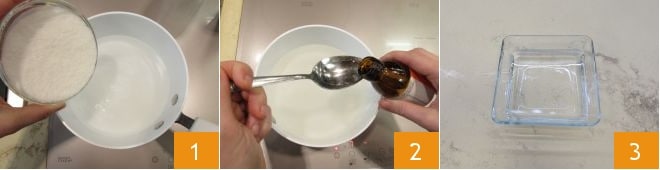 Finally, focus on preparing the syrup. Pour the water and sugar into a saucepan 1. Heat it on the stove until the sugar is completely dissolved, then remove it from the stove and add the maraschino flavor 2; if you prefer an alcoholic syrup, you can use maraschino liqueur. Transfer the syrup to a baking dish and let it cool 3.