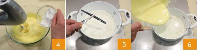 Then add the corn starch 4 and continue to beat. Remove the vanilla bean from the milk and cream mixture 5, and while stirring quickly, add the prepared egg and starch mixture 6.