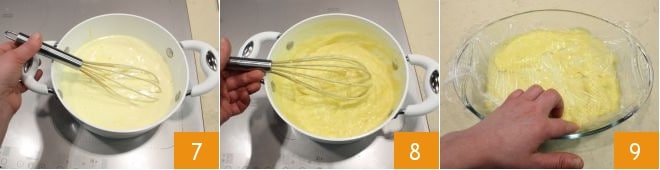 Turn the heat back on to low and continue stirring constantly 7 until your custard thickens 8. At this point, turn off the heat and transfer the cream to a shallow and wide bowl. Immediately cover it with plastic wrap in contact with the cream 9 to prevent a skin from forming. Let it cool first at room temperature and then in the refrigerator.