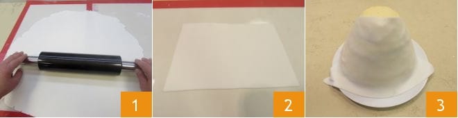 At this point, start decorating your Barbie cake. Take 5.3 oz of the 17.6 oz of white sugar paste and roll it out on a mat 1 dusted with cornstarch. Make sure to form a rectangle 2, thin enough, about 1/8 inch thick, that will allow you to cover about half of the cake. Then position it horizontally on the part of the cake facing you and make it adhere well to the buttercream, without folding the upper edge of the sugar paste layer over the sponge cake 3.