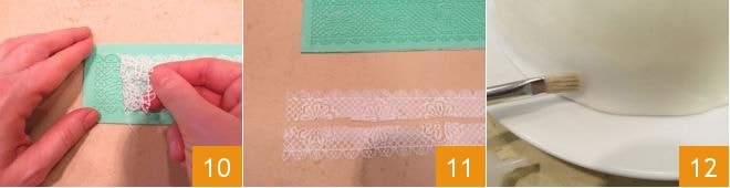 Then bake in a preheated static oven at 250°F for 5-6 minutes (or in a preheated convection oven at 210°F for about 4 minutes). Be sure to always cover the decoration preparation when not in use to prevent it from drying out. Once baked, let it cool and gently remove the lace sheet 10. Cut it in half horizontally 11, and to apply it, brush the edible glue on the lower part of the cake covered with sugar paste 12.