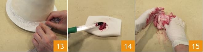 Stick the lace strip, making it adhere well to the glue 13. Pinching parts of the lace between your thumb and index finger, as you stick it, you will be able to create folds. Continue this way, and always using the edible glue, stick the various lace strips from bottom to top until covering the entire surface. Take the remaining sugar paste (12.3 oz) and add a couple of drops of pink coloring 14, then work it with your hands 15 until you obtain a uniform color. If it seems too light, add another drop of coloring and work it again to achieve the desired shade.