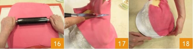 At this point, roll out your pink sugar paste on a mat dusted with cornstarch to a thickness of about 1/4 inch 16 and use it to finish the other side of the skirt. Gently place the sugar sheet on the uncovered part of the cake, always using edible glue to stick it to the part already covered with white sugar paste. Try to create folds with your fingers to make the skirt look as natural as possible. Trim the excess paste again, both at the top 17 and the bottom 18.