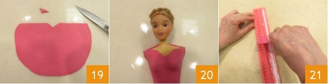 Work the scraps of pink paste with your hands for a few minutes to smooth it out again. Roll it out and use a part to make the bodice of your Barbie, reproducing the neckline by making a v-cut on the top 19. Then cover Barbie’s torso 20, and remount the arms. Use the decoration preparation and, as previously done for the lace, add a spoonful on a mat to create the beads, and scrape with a scraper 21.