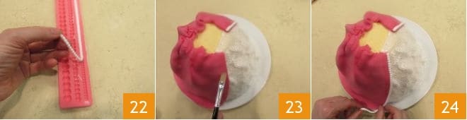 Bake again in a preheated static oven at 250°F for 5-6 minutes. Let cool, then remove the bead strip 22, and stick it with edible glue around the skirt's edge (23-24). Keep a small piece aside for making the necklace and bracelet.