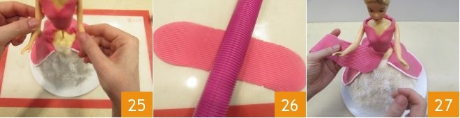 Now place Barbie's upper body in the hole in the center of the cake 25. To make the final embellishments, use the remaining pink sugar paste and cut a strip about 2.5 inches wide. Decorate it with a cake design rolling pin to create horizontal lines 26. Shape the edges with a small knife, brush the back with edible glue, and attach it between the torso and skirt to cover the exposed parts 27.