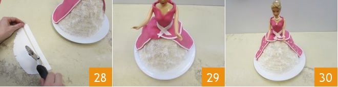 Roll out the scraps again and use a small knife to cut a tiara and position it on Barbie's hair. Also, place the bead strip around the neck and join the ends with glue, repeat the same operation around the arm to create the bracelet. Roll out the remaining white sugar paste and cut a strip of about 1/2 inch 28, brush the back with glue and attach it to Barbie's waist to make the belt 29. Make small flowers from the paste scraps to embellish the skirt. Your Barbie cake is ready 30, refrigerate for a couple of hours before serving.