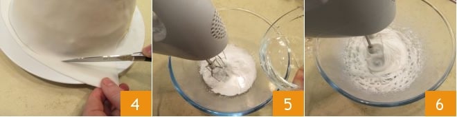 Trim the excess sugar paste at the base of the cake, cutting it following the exact perimeter of the cake 4, thus avoiding it protruding onto the tray. Work the scraps of paste with your hands and set them aside, wrapped in plastic wrap, for the final decorations. Place the cake in the refrigerator and focus on the decorations. Heat the water in the microwave to 104°F, then add it to a bowl where you have already poured the decoration preparation 5. Mix with a beater until you obtain a creamy mixture 6.