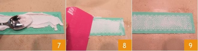 Take a spoonful of this mixture and spread it on a silicone mat suitable for making lace 7. Use a scraper to scrape the surface 8, removing the excess amount 9.