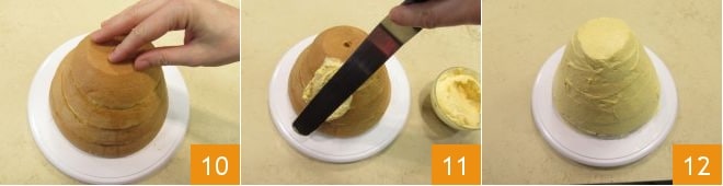 Place the last disc 10 and, using a spatula, start spreading the buttercream on the cake 11, until covering the entire surface 12, to best adhere the sugar paste which you will use later to cover the cake.
