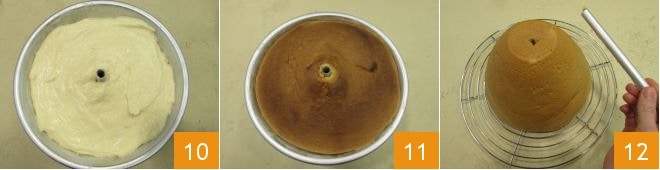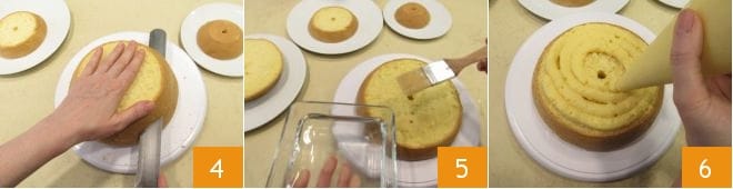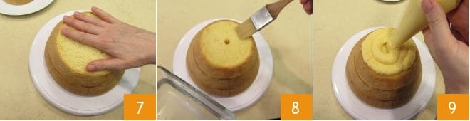 Continue in this way by placing the appropriate sponge cake layer 7, from the largest to the smallest, to reform the cake. Complete your cake by soaking each layer 8 and filling it with custard 9.