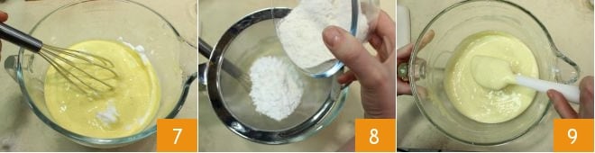 and mix with a whisk 7 (or a spatula) from top to bottom to not deflate the mixture. At this point, add the sifted flour and potato starch together 8 and mix them into the batter with a spatula 9.