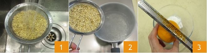 To prepare the barley and salmon salad, first rinse the barley under running water 1, then cook it in boiling water 2 for 20 minutes or as indicated on the package. While the barley is cooking, prepare the accompanying sauce: place the yogurt in a bowl, season with the grated zest of an orange 3