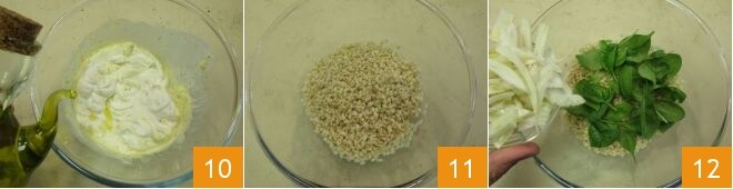 and olive oil 10, mix and set aside. Meanwhile, the barley will have finished cooking, drain it and let it cool in a bowl 11. Once the barley is cool, add the washed and dried baby spinach and the sliced fennel 12.