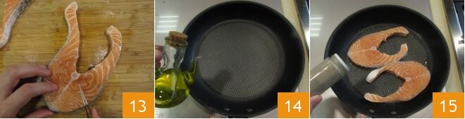 Now prepare the salmon: remove the bones with tweezers 13, then heat the olive oil in a pan 14, place the salmon fillets, salt, pepper 15, and cook them for 2 minutes on one side and 1 minute on the other.