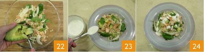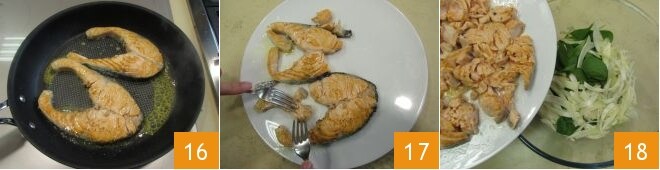 Once cooked 16, transfer the salmon to a plate and cut it into small pieces 17. Add the salmon pieces to the barley salad 18.