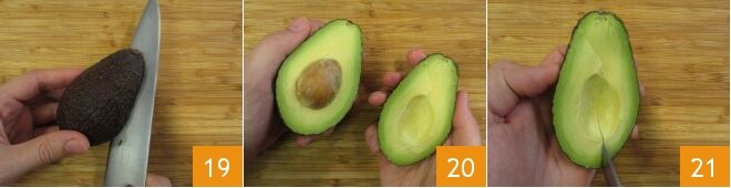 Now handle the avocado: cut it in half (19-20), remove the pit, and score the flesh by making horizontal and vertical cuts 21: