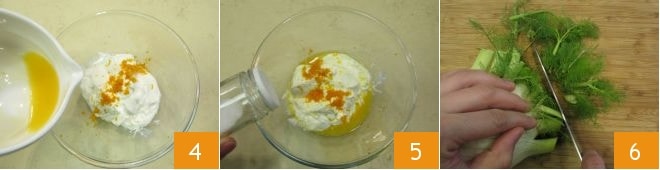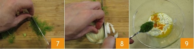 and chop them finely 7, then slice the fennel 8 and set aside. Flavor the yogurt sauce with the fennel fronds 9