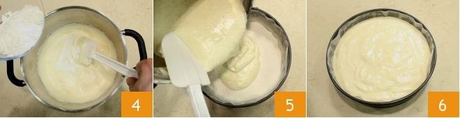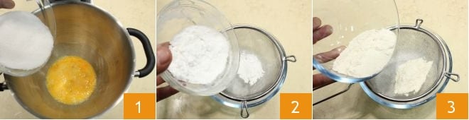 To prepare the basket cake, start with the sponge cake: in the bowl of a stand mixer, pour in the room temperature eggs; add the sugar 1 and start whisking: they should become frothy. Then, in a separate small bowl, sift the flour 2 and potato starch 3.