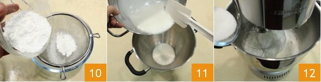 Sift the powdered sugar 10; then pour the egg whites into the bowl of a stand mixer 11, add the other half of the granulated sugar gradually 12, and the powdered sugar;