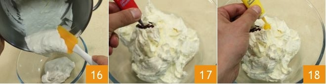 When all the butter is incorporated, transfer the cream to a bowl 16, then add the red food coloring 17 and add the yellow one 18 to achieve a bright yellow color.