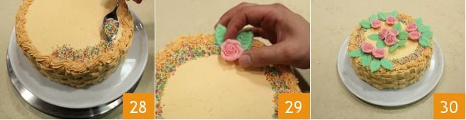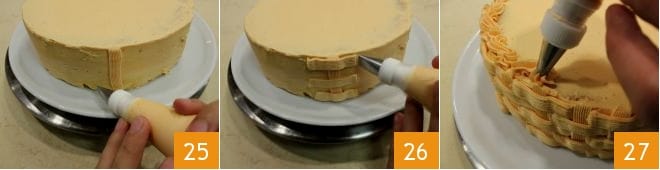 Proceed to decorate with the piping bag with a Wilton 26 nozzle: create a vertical strip, then three horizontal ones of the same length, and continue this way around the entire circumference of the cake to recreate the weave pattern of a wicker basket. Then replace the Wilton nozzle with a star one and decorate the edge of the surface 27.