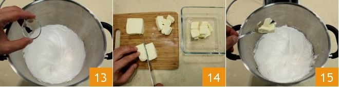also add the vanilla bean seeds 13 and continue to work with the whisk. Replace the whisk of the stand mixer with the paddle, then cut the softened butter into pieces 14 and gradually add it to the sugar and egg white mixture and continue mixing with the stand mixer 15.