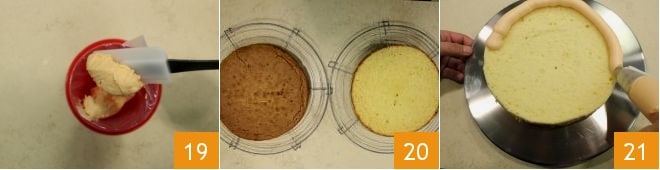 Once colored, transfer one-third of the cream to a piping bag with a plain nozzle, one-third to a piping bag with a Wilton 26 nozzle (flat and serrated), and leave one-third of the cream in the bowl. Then cut the now-cold sponge cake into two discs 20 and with the piping bag with the plain nozzle, create a border of cream on the base of the sponge cake 21.