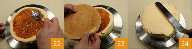 Then fill the inside with apricot jam 22 and cover with the other sponge cake disc 23. Spread the surface and the edges with the cream kept aside in the bowl 24.