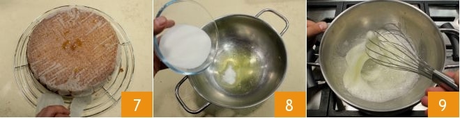 When it's cooked, remove it from the oven and let it cool slightly, then turn it out and let it cool completely on a wire rack 7. While the sponge cake cools, prepare the buttercream: in a mixing bowl, pour in the egg whites (with the yolks you could make a custard) and half the granulated sugar 8. Place everything over a double boiler to cook the egg whites: it is important that the water does not touch the bottom of the pot containing the egg whites to ensure controlled, low-temperature cooking. Stir with a hand whisk 9 and when they become frothy, remove them from the heat (you can measure the temperature with a food thermometer; it should be 149°F).