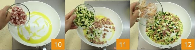 Heat a drizzle of olive oil in a pan, add the sweet bacon cubes 10 and brown them for a few minutes, then add the zucchini 11 and cook for 10 minutes, then add the prawns 12 and continue for 5 minutes.